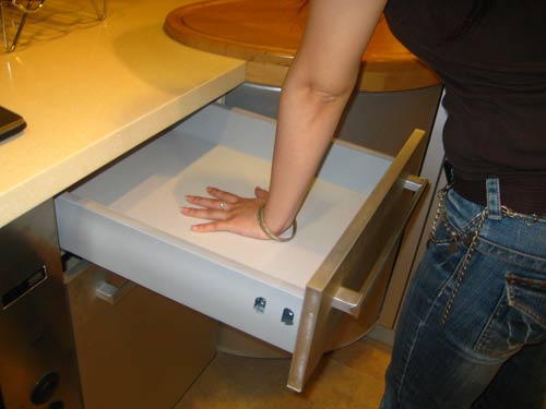 抽屜和拉出式藍(lán)、架安裝是否穩(wěn)固順暢,由導(dǎo)軌質(zhì)量及安裝水平?jīng)Q定。隨意打開一扇門、一個抽屜或拉藍(lán),應(yīng)做到順暢、無聲、輕巧、軟彈回;帶氣壓撐桿的上翻門應(yīng)能承受門板下落的重量。雖然是很小的細(xì)節(jié),卻是影響櫥柜質(zhì)量的重要部分。