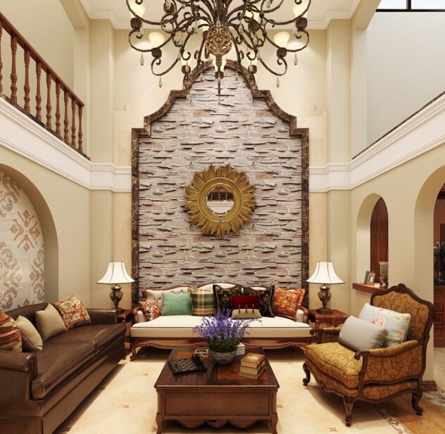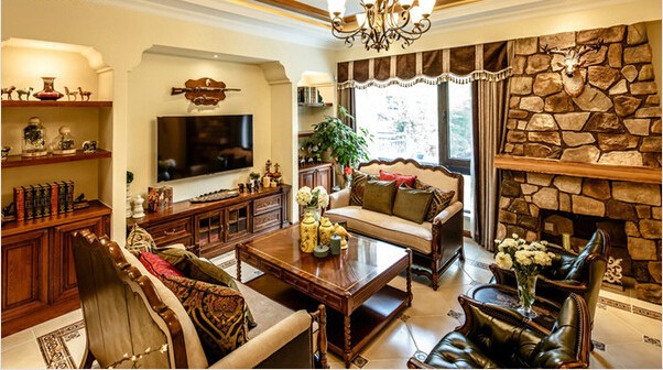 客廳是別墅裝修的重點(diǎn),是主要的待客區(qū)域??蛷d裝修要突出整個(gè)家的特色,整體簡(jiǎn)潔明快。美國(guó)人喜歡有歷史感的物件,在客廳常擺放一些仿古的藝術(shù)品或使用仿古的地面磚、石材、墻面裝飾等。粗狂石頭的壁爐是美式風(fēng)格的“保留曲目”,因?yàn)闊熁鹦枰⌒奶幚?,目前,使用不廣泛。