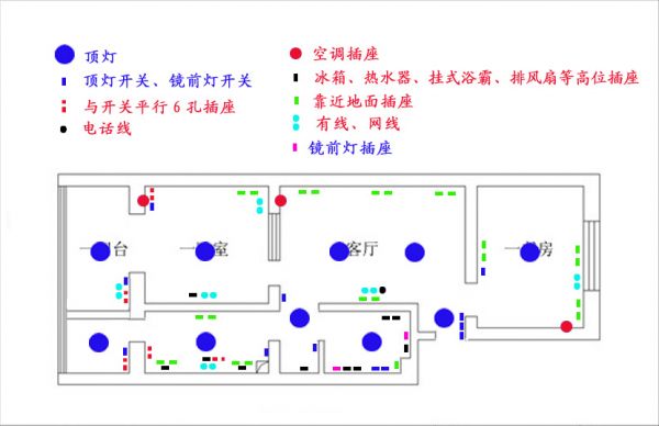一、何為開工之前無計劃? 俗話說得好:萬事開頭難!裝修這種大事也是一樣,在進行電路改造之前如果不能和電改公司做好一份詳細的計劃,之后必定后患無窮(他們巴不得你沒有計劃)“加價不加量”這種事必會層出不窮,那個預(yù)算也就會蹭蹭蹭的往上漲。 二、如何解決? 為了避免這種最坑爹的情況發(fā)生,每個裝修的業(yè)主都要在之前做好一個明確的計劃——一個關(guān)于自家日常用電的計劃,并且與電改公司達成一個詳細并且正確可實施的設(shè)計方案。 三、如何做計劃? 大多數(shù)人對于裝修其實都是一頭霧水的,更別提讓他們做出一個相對完整詳細的計劃了。其實做詳細的電路計劃并沒有那么難,首先要想好你哪些地方要用電,用多少電(一定要仔細并且全面),并自己畫出草圖。 啥?你跟我說畫圖?我TM一個文科生圖都看不明白,你讓我畫圖? 其實沒那么難,只需要有一張戶型圖、一支筆就可以。 四、我們需要多少個插座? 上圖我們也看到了,一個屋子里會有很多的插座(圖中的綠點),但是我家到底需要多少個插座呢?這個問題需要因人而異,具體家庭具體分析。比如我想在廚房安一個洗碗機,但是隔壁的老王并不想安,這就會導(dǎo)致插座個數(shù)的差異。 但是,有一些東西是每個家庭都需要的!我不知道插座數(shù)量的最大值但是我可以知道插座數(shù)量的最小值。所以我只能提供最小值! 家庭必備家用電器(不可能比這個再少了): 綜上所述,僅僅為滿足最最基本的生活標(biāo)準(zhǔn),家里至少要10個插座。當(dāng)然通過插線板的擴展,這十個插座也是可以滿足一些提升生活樂趣的要求。如果想完美提升居住的樂趣,那就需要10個以上的插座了,有些東西不是插線板能解決得了的! 但是,僅僅估算出自己家的插座個數(shù)也還不夠,最好還要估算出家用電器的具體位置,最好讓電路工人把位置畫在墻上(就像下圖那樣),以便于施工順利進行。 當(dāng)這些覺得都滿意了,就拿著自己畫的圖請專業(yè)的電改工人來實地考察,并且把方案系統(tǒng)的優(yōu)化并作出預(yù)算,這就ok了。 小提示:記得在合同里寫上誤差的一個頂峰值,比如雙方商定誤差超過10%的部分業(yè)主可以不對其付款。 這不就根除了因為前期不溝通或者溝通時留下很多“遐想”所造成的預(yù)算超支嘛! 所謂裝修處處都是坑,就看你小不小心了,一不小心就掉進坑里。要保持一雙火眼金睛,還有一顆精打細算的心。