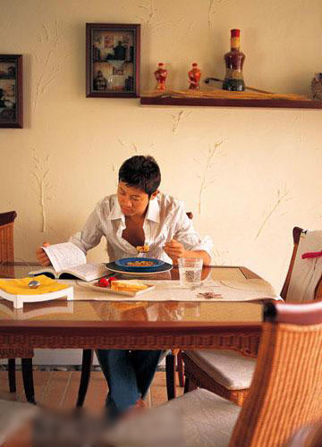 陽臺改成的書房和客廳的沙發(fā)是張茜最愛待的地方,“我喜歡在陽臺那里曬著太陽上網(wǎng),也喜歡窩在沙發(fā)上看碟,不過無論我在哪里,‘帕她呀’都會圍著我轉(zhuǎn)。”