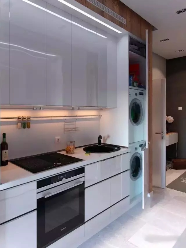 這個(gè)是給單身公寓的最佳選擇。如果你各個(gè)功能區(qū)都被安置得滿滿當(dāng)當(dāng),而陽(yáng)臺(tái)廚房都很迷你,沒(méi)有洗衣機(jī)的藏身之處,你可以考慮一些被你遺忘了的的地方,如玄關(guān)處、柜子里,走廊盡頭。這個(gè)方法使用的是前開(kāi)門(mén)的滾筒洗衣機(jī),開(kāi)合方便,上面還可以做吊柜,便于儲(chǔ)存晾曬好的衣物還不占用上部空間。