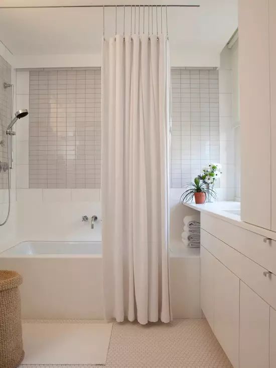 除了玻璃隔斷之外,還有一種隔斷對小戶型衛(wèi)生間很適用,那就是用浴簾,既省空間又省錢,還不擔(dān)心會像玻璃一樣爆炸。▼
