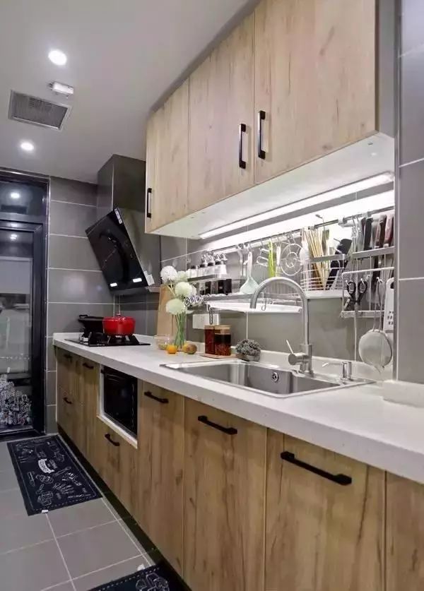 ▲玄關(guān)的另一側(cè)就是廚房,淺灰色的墻地面瓷磚,原木色的櫥柜門,白色臺(tái)面,這是最適合北歐風(fēng)的廚房,素雅、明亮而又溫馨。