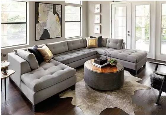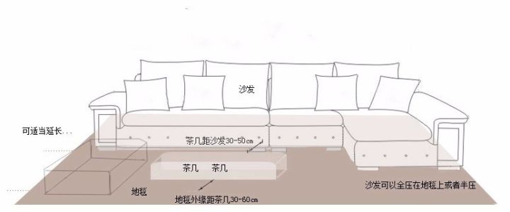 這樣鋪設(shè)方式,通常適用于空間較小的客廳內(nèi)。就是需要利用一款地毯使得空間在數(shù)據(jù)上有延展的效果。這樣一來,我們地毯選擇的尺寸(1.4*2米或者1.6*2.3米),怎么鋪的好看下面這張圖會教給大家的