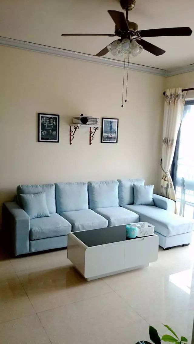 層高不是很高,所以客廳也沒(méi)做吊頂;沙發(fā)看上去顏值不高,但是很舒服,價(jià)格也還可以。茶幾是搭配電視柜一起買(mǎi)的。