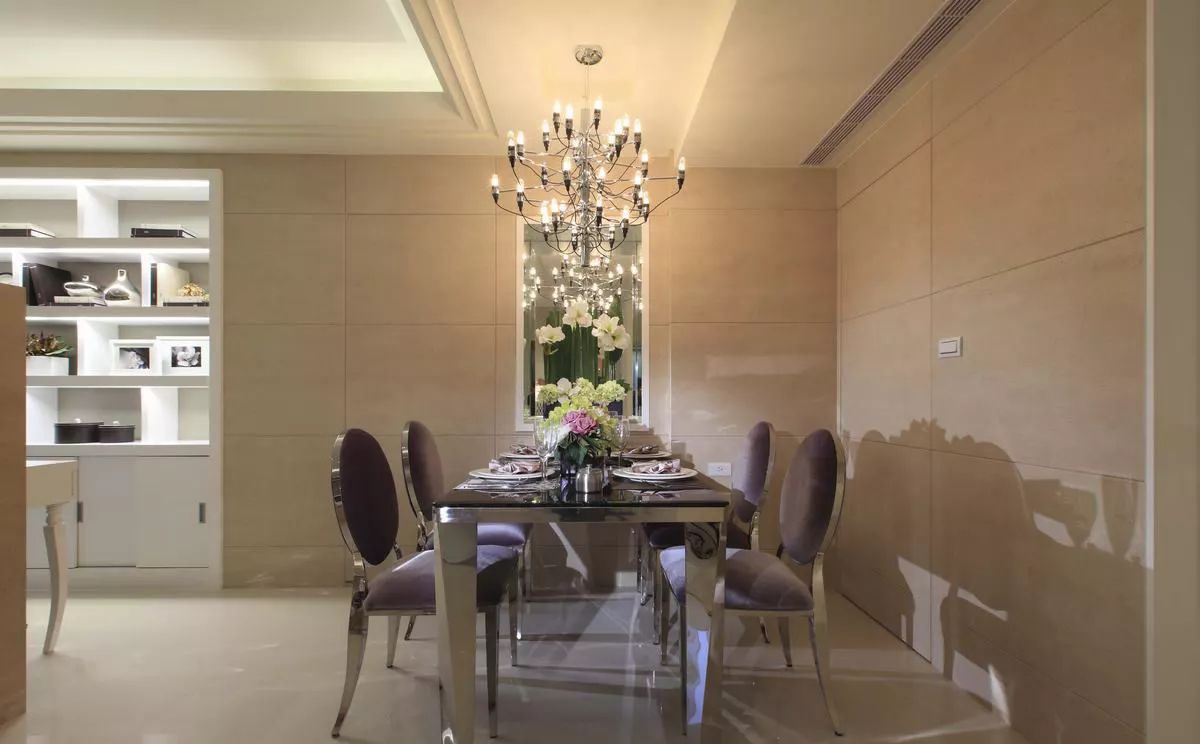 ▲餐廳主墻大有玄機,一部分作為餐廳背景墻優(yōu)化良好就餐氛圍,另一方面設(shè)置隱形門作為臥室和廚房空間的入口。