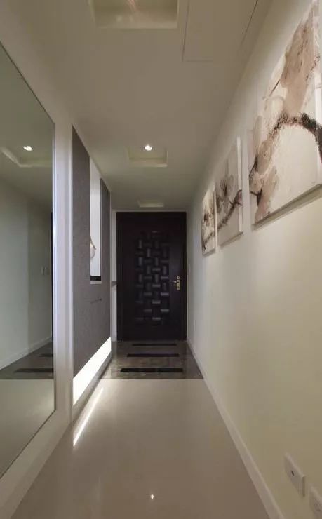 ▲過道比較狹長,設(shè)計師以鏡面元素增加空間亮度,地面也配上大理石材質(zhì),再配上墻面柔和燈光,完美解決采光不足困擾。