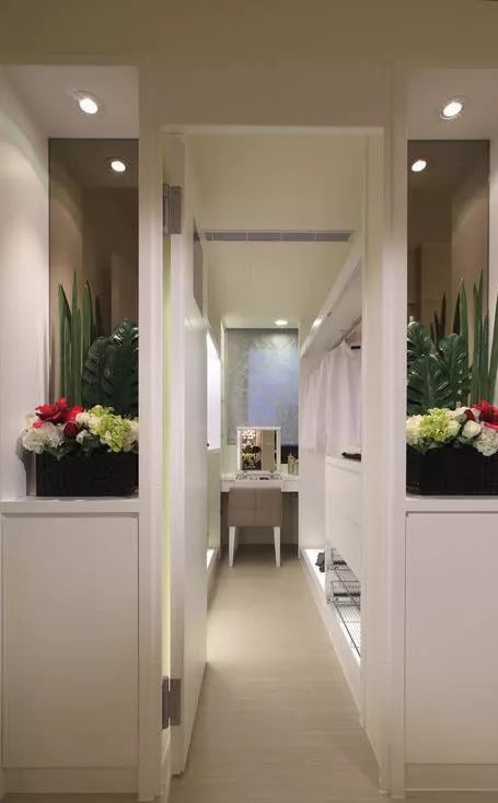 ▲衣帽間巧妙藏于對稱過道內(nèi),只占用極小的空間便能滿足業(yè)主衣物收納和梳妝需求。