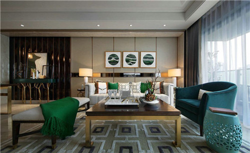 看起來非常的大氣,小編找了好一會,才看到,地毯也是用綠色,與空間色彩綠色相互呼應(yīng),相互襯托。大大的落地窗,當(dāng)你站在那里,看到一望無際的風(fēng)景,讓你心中澎湃。