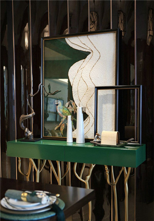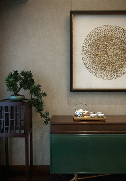 家中使用了大量的實木家具,用綠色作為點綴,彰顯出一絲絲的高貴、典雅,又有了一絲絲的沉著、智慧。畫框是女主人的手工制作,把這些大大小小的石頭,按照大小比例擺放,又有圓圓滿滿的寓意,如果喜歡手工的小伙伴,可以試試呦。