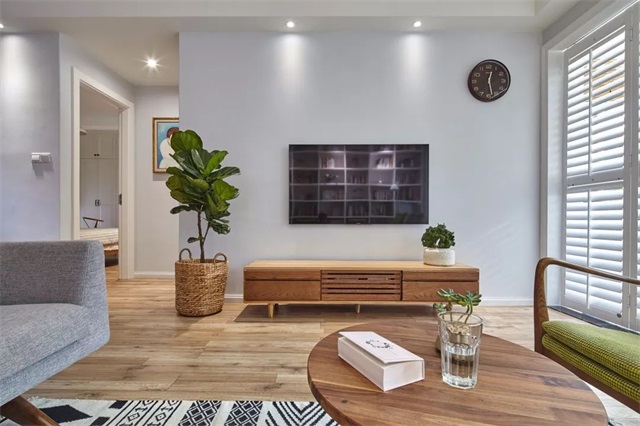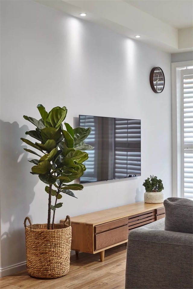 電視采用掛置墻上的方式,不僅使整個設(shè)計更加簡約,也為地柜節(jié)省了空間。左右兩旁種植的植物渾然天成,與整體風(fēng)格協(xié)調(diào)一致,更增添了一抹生機、綠意。