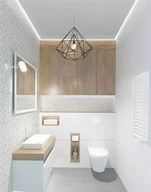 除此之外還可以將衛(wèi)浴鏡與嵌入式收納結(jié)合起來,保證美感的同時(shí),還可以在墻體上方放置物品。
