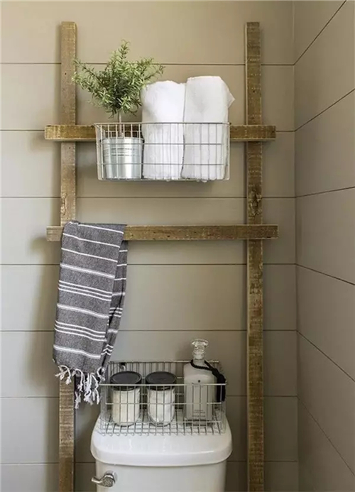 如果你覺得上面都比較麻煩,那么可以選擇擺一個(gè)小梯子在馬桶上方,靠墻安放,不會(huì)占用過多的空間,收納毛巾等很是方便。