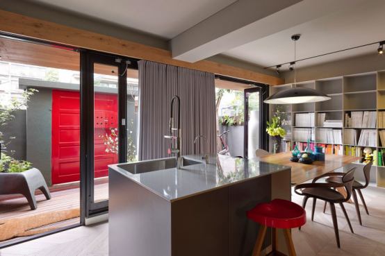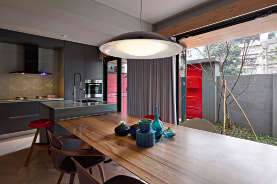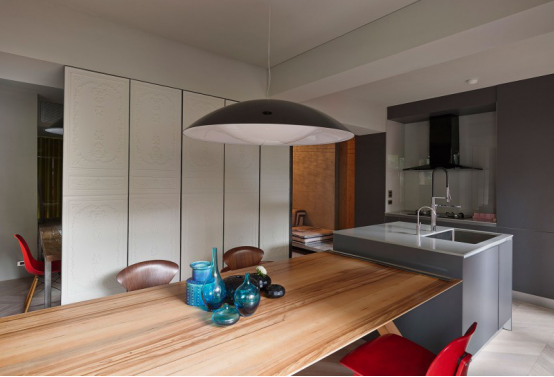 藍色花瓶、紅色座椅、淺灰色的吊燈也讓家變得跳動起來了。