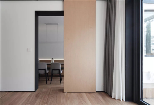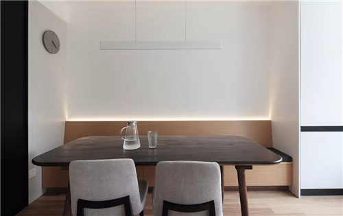 以簡(jiǎn)單的灰白色系勾勒出的空間,衍生一種安靜、柔和之美。木質(zhì)的餐桌、卡座式餐椅,原木的元素給用餐區(qū)增加了一抹淡淡的清香。