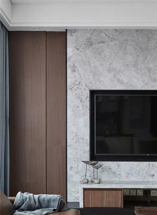 棉麻質(zhì)感的淺色布藝沙發(fā)搭配深色實(shí)木極簡茶幾和長凳,溫馨高雅;電視墻用整塊大理石做外凸設(shè)計(jì),兩側(cè)輔以木工板打底,現(xiàn)代質(zhì)感;電源全部隱藏在電視柜的下方,保持視覺上的干凈整潔。