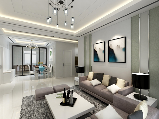 象牙白皮護墻板點綴抹茶綠墻板與皮藝壁畫,整個客廳顯得清新而淡雅。