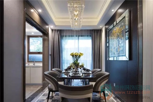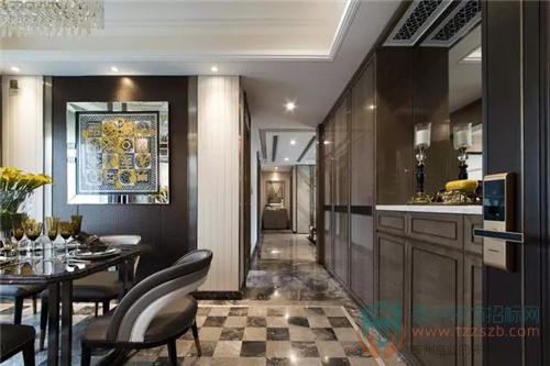 餐廳深淺灰調(diào)石材交錯構(gòu)成的幾何圖案地板,帶來視覺上的層次感,又賦予和諧的品質(zhì)感;陳設(shè)其上的優(yōu)質(zhì)皮革,將工匠的熱情投入到日常生活,彰顯了空間并不張揚(yáng)的奢裝理念。