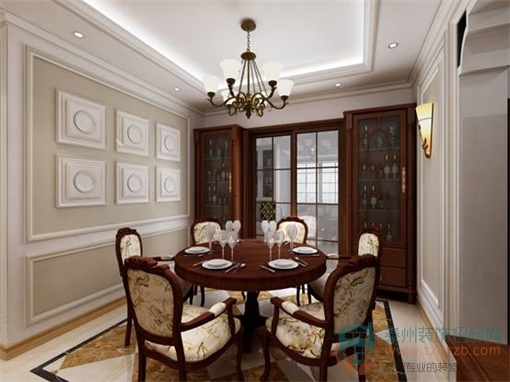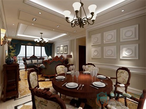 餐廳是傳統(tǒng)西方大宅中最具有家庭氣氛的空間。本案運用復古餐桌椅及經(jīng)典銅式吊燈,凸顯就餐的氛圍,又在餐廳墻面上采用皮護墻板裝飾白瓷的形式,表達出大氣又不失溫馨的效果和和樂融融的生活情調(diào)。