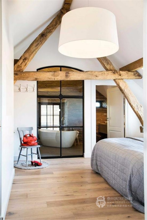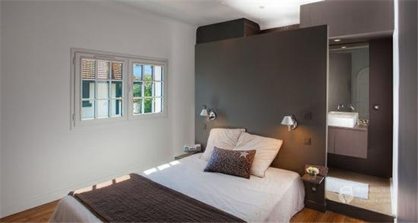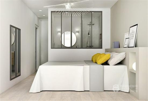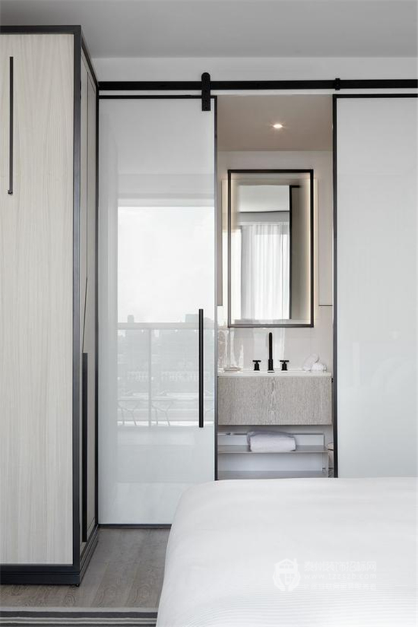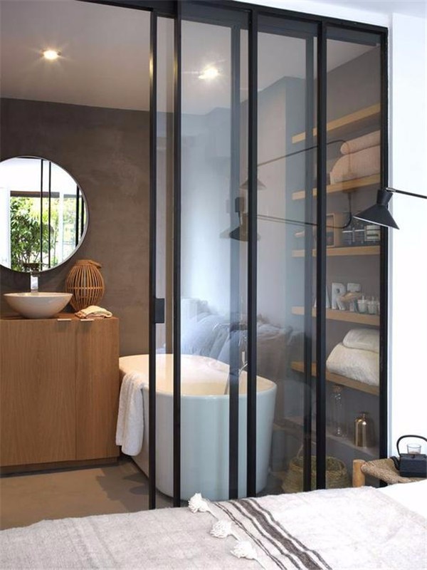 用黑框玻璃窗來(lái)阻斷衛(wèi)生間與臥室的界限,不僅可以解決暗衛(wèi)本身存在的采光問(wèn)題,而且視覺(jué)上更具時(shí)尚效果,令整個(gè)臥室的質(zhì)感瞬間提升。