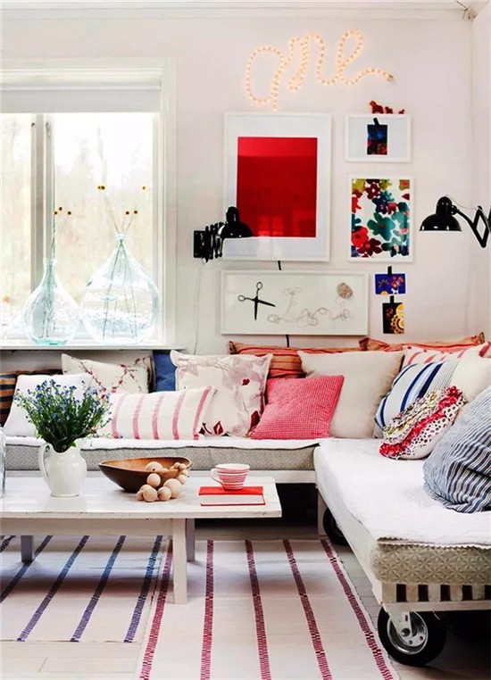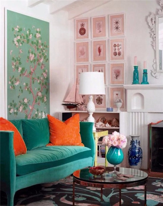 你可以把電影里的靈感直接運用過來,冷色調(diào)的翠綠造成視覺上的后退感,令空間擴大而富有層次,鮮紅色沙發(fā)像兩朵盛放的玫瑰,熱烈而醒目,整個空間在這兩種色彩的碰撞下極富活力。