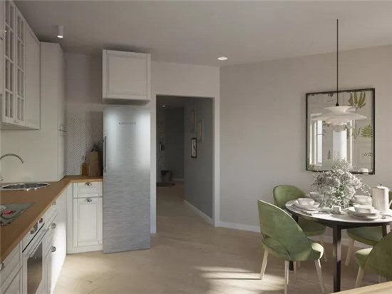 ▲ 廚房、餐區(qū),地面用斜拼鋪設(shè)