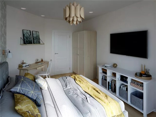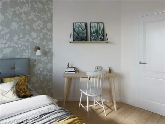 ▲ 臥室,利用藍(lán)色壁紙營(yíng)造床頭背景
