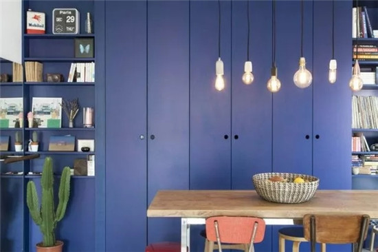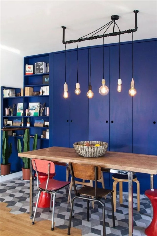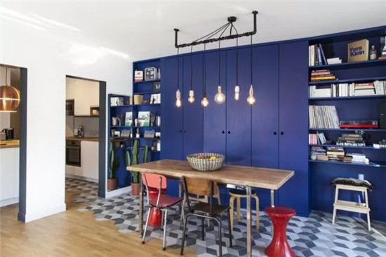 室內(nèi)餐區(qū)及廚區(qū)利用六角磚與地板銜接,既便于打掃,又為室內(nèi)帶來(lái)不同的趣味。同時(shí),一側(cè)的系統(tǒng)柜被涂刷成藍(lán)紫色,提供了充足的收納及展示功能。