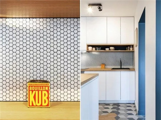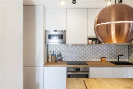 廚區(qū)櫥柜采用木臺(tái)面搭配白色面板,櫥柜門(mén)采用隱形拉手。廚房背板采用小六角馬賽克鋪設(shè)。