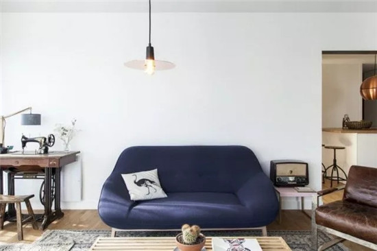 客廳當(dāng)中,沙發(fā)背景墻留白。一臺(tái)老式縫紉機(jī)被放在了沙發(fā)旁,既用作裝飾也有實(shí)際用途。
