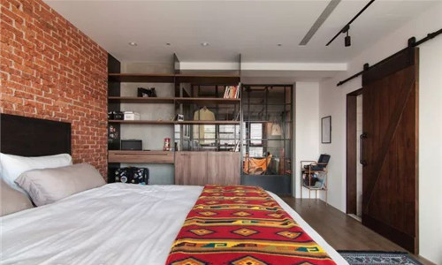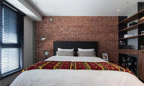 主臥床背景的紅磚是真正的紅磚墻,設(shè)計(jì)師還特意讓施工師傅鑿出帶破劃的痕跡,最后再用具有滲透性的保護(hù)漆涂刷,這讓就不會(huì)積灰掉灰了。
