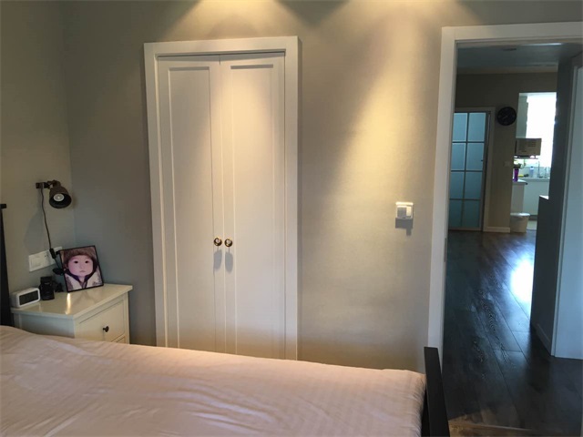 主臥墻體以灰白色為主調,格調雅致簡單,最驚喜的就是專門為主臥設計了一個內嵌隱形的更衣室,既增加美觀又方便收納,夫妻兩特別喜歡。