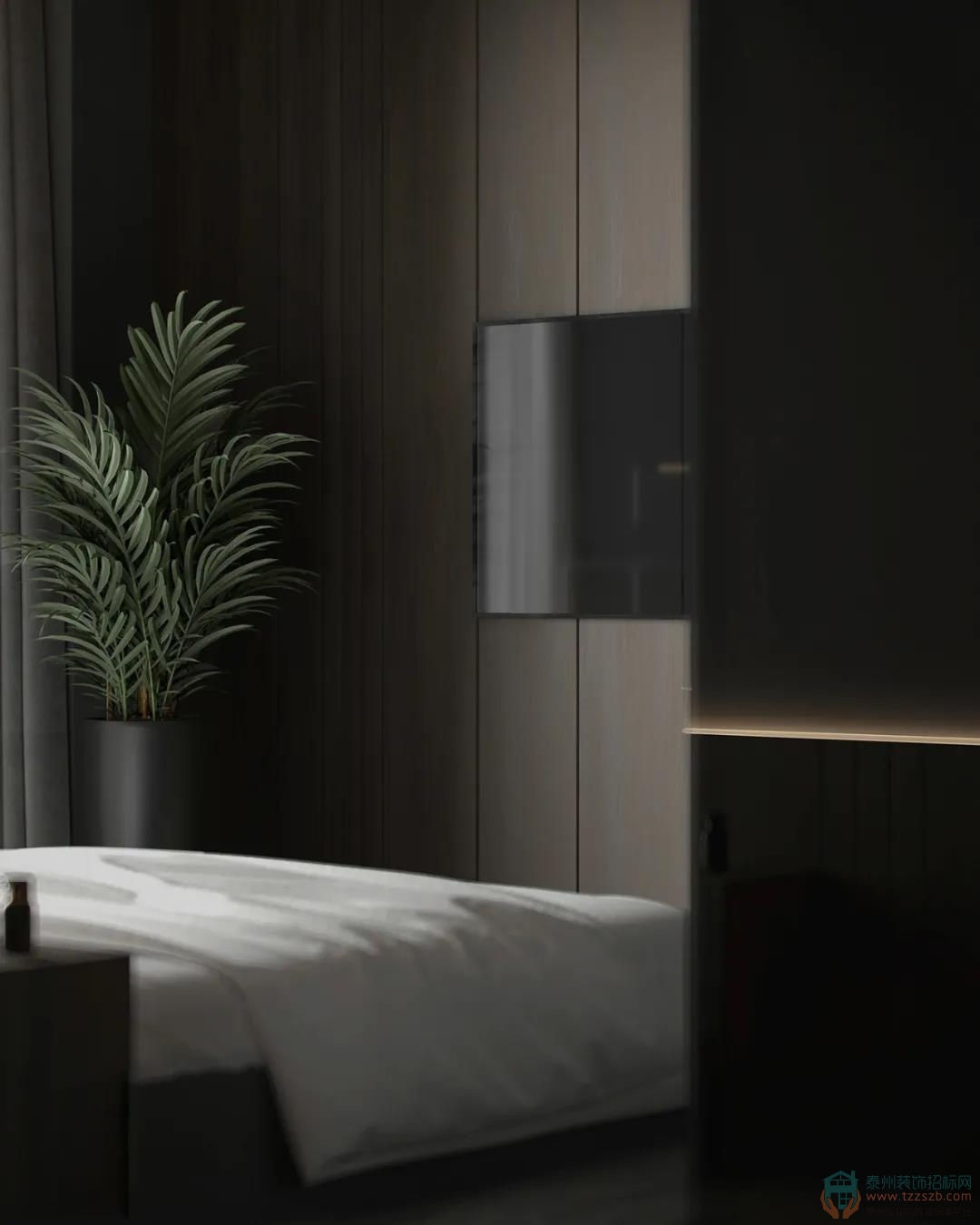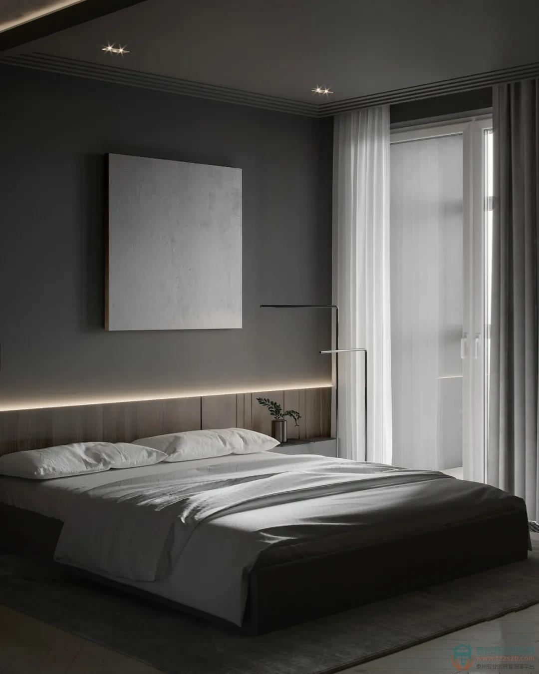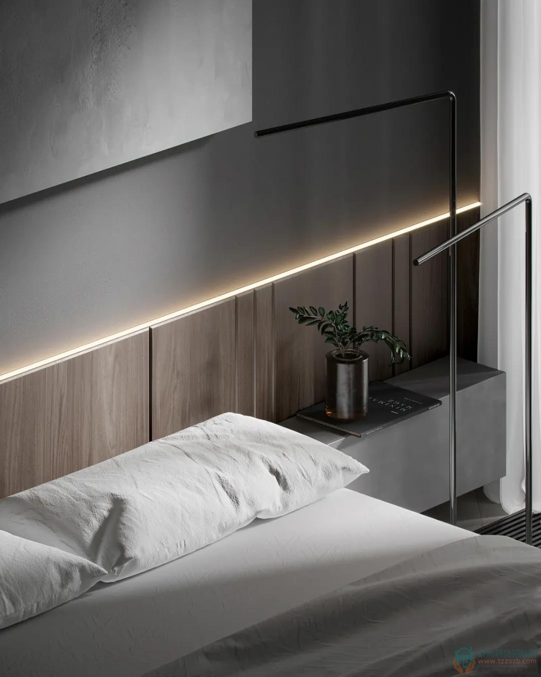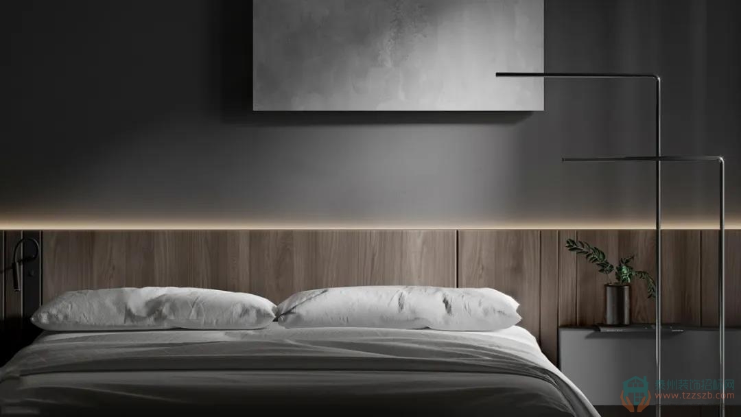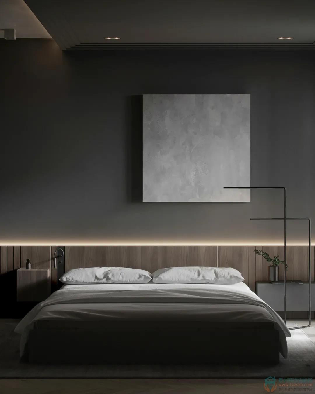 臥室背景墻的半截護墻板內嵌了燈帶,溫和的暖光調和了深色調的空間,給現(xiàn)代感極強的空間中注入一些暖意。