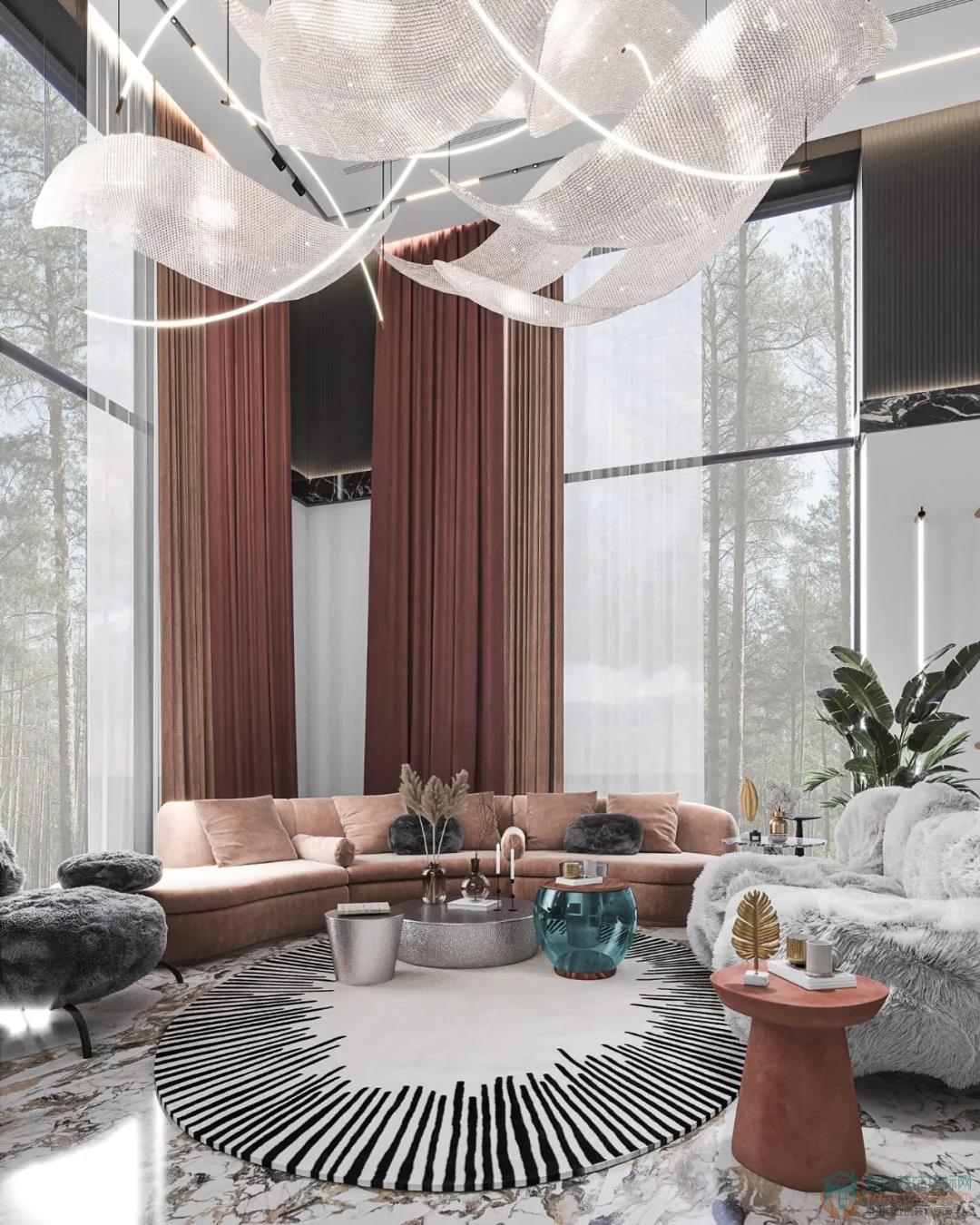 客廳面積90㎡,天花板高度6米,寬大的全景窗戶給人留下了深刻的印象。流動(dòng)的枝形吊燈可以填補(bǔ)空間,多層次的光線營(yíng)造出多維感。