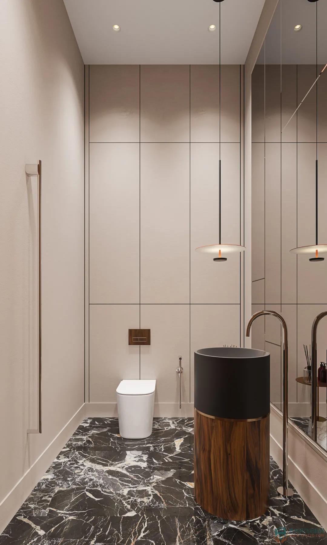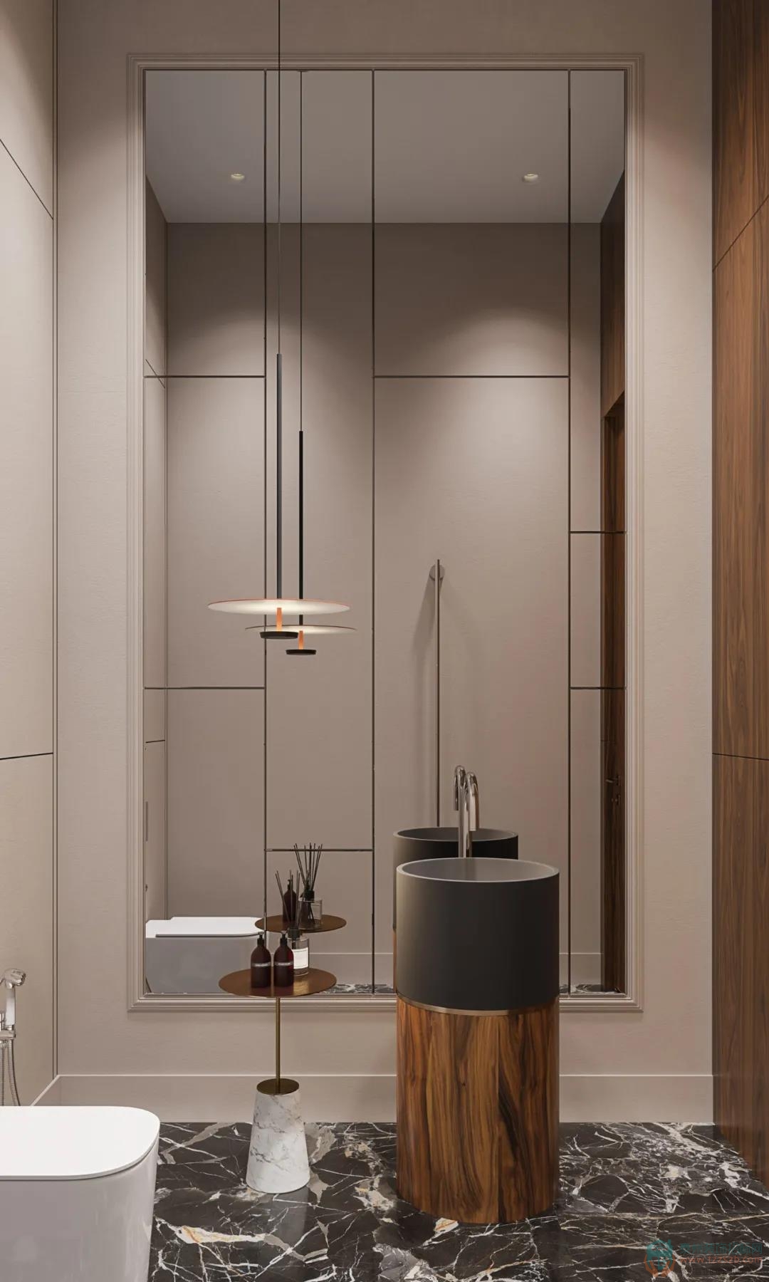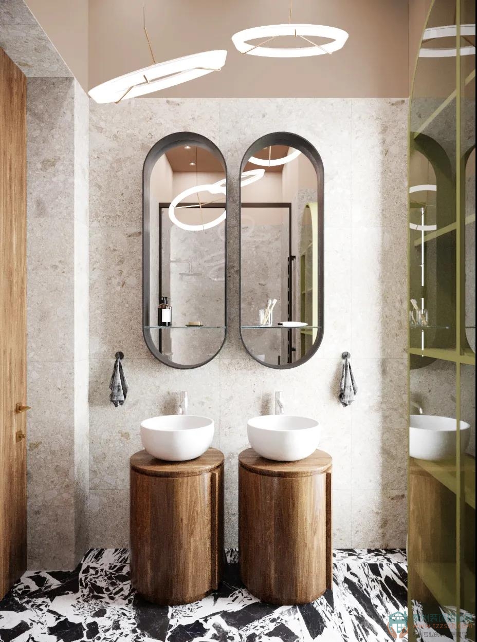 由于墻壁上部的面板為深灰色陰影,因此看起來(lái)更親密和舒適。不同色調(diào)的大理石,胡桃木貼面板, 墻紙中的大膽圖案以及多樣的家具組合,創(chuàng)造出豐富想象空間。
