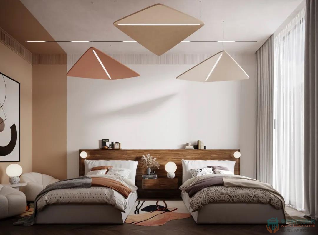 在同樣重要的第二間臥室中,使用了大量的紋理和顏色組合。柔和的綠色,米色棕色調(diào)。皮革,絲綢和天鵝絨的質(zhì)感創(chuàng)造了印象的多功能性,打開(kāi)了感知的觸覺(jué)通道。