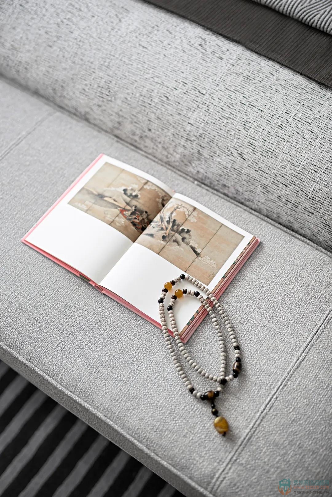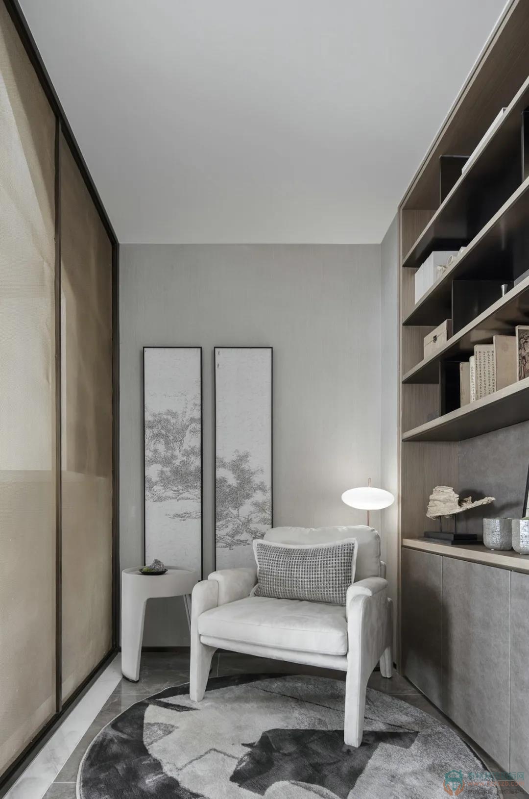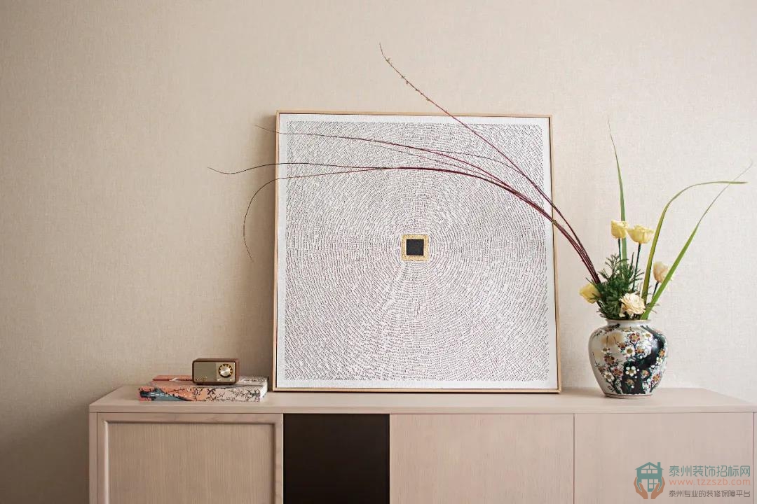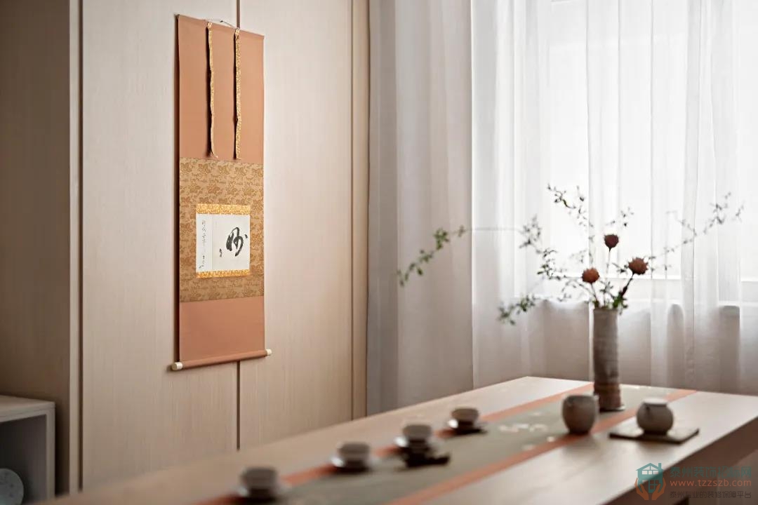 閱讀使人閑適,墨香使人靜寧。幾本日式書籍,充滿禪意的幾處細(xì)枝綠葉,同樣散發(fā)著溫度的宣紙拼貼畫,足矣營造出居住者憧憬的生活向往:坐看云起,展卷閑茗,詩意棲居,方寸凈明。