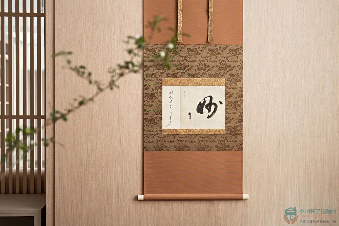 茶藝區(qū)的茶掛來源于日本茶圣——千利休所書寫的一行書“妙”。 “妙”,用來表現(xiàn)一些抽象的內(nèi)在肌理,而這些肌理當(dāng)今依然無法明確解說,但人們卻可以自然的體會(huì)到它的存在,這樣奇特的、難以描摹的感受就自然而然用一字“妙”來表達(dá)。