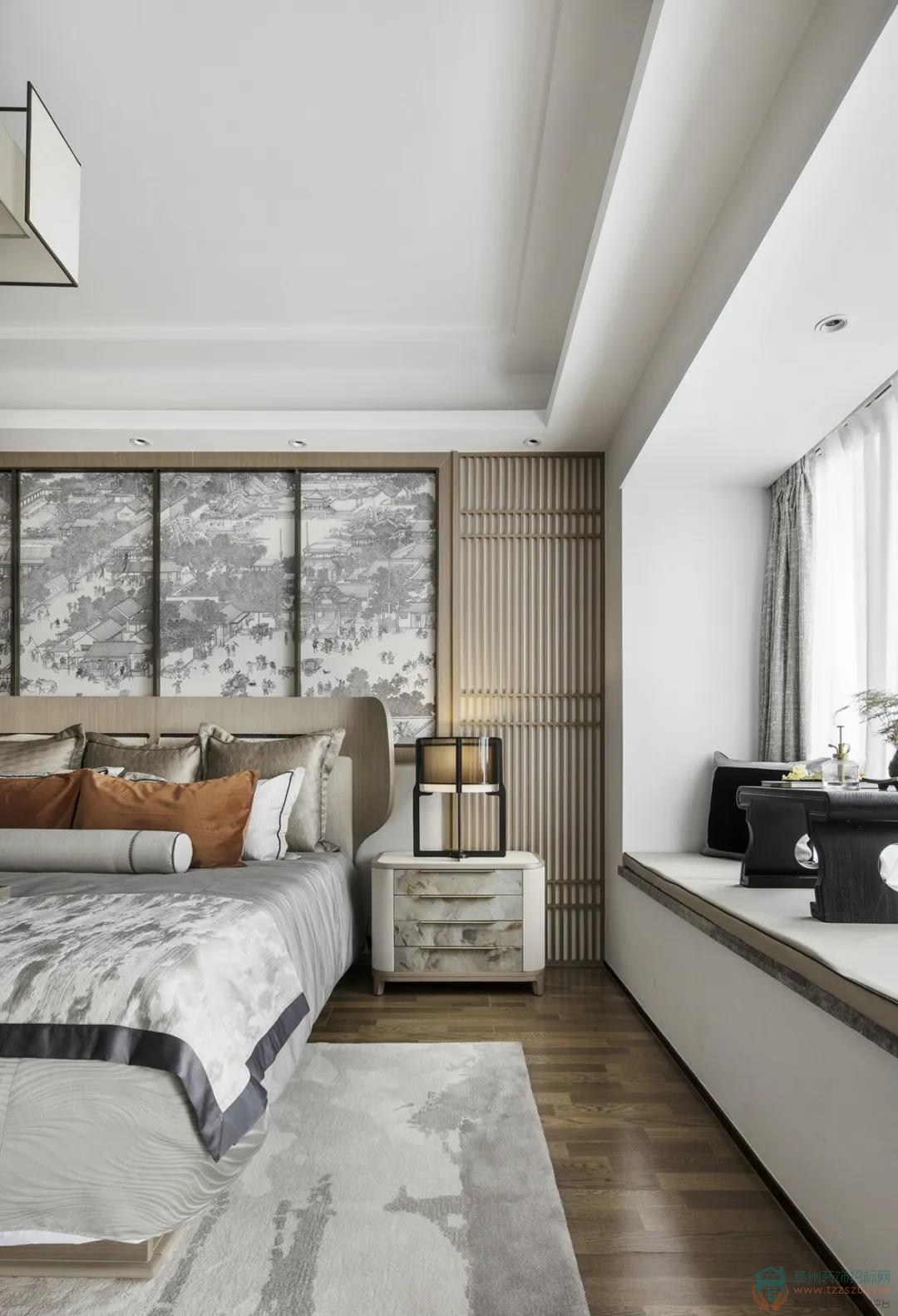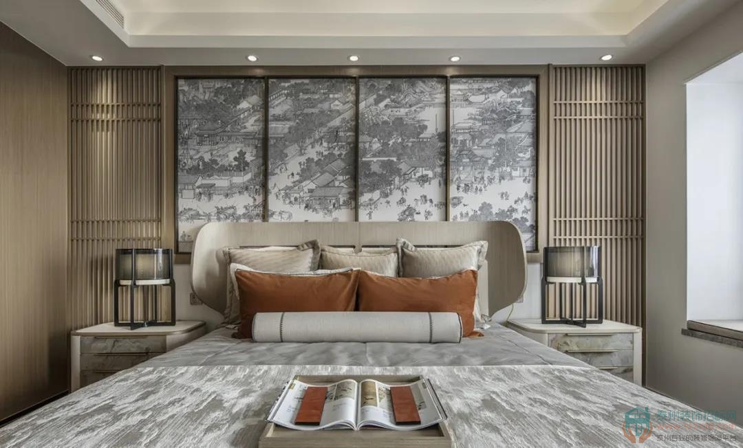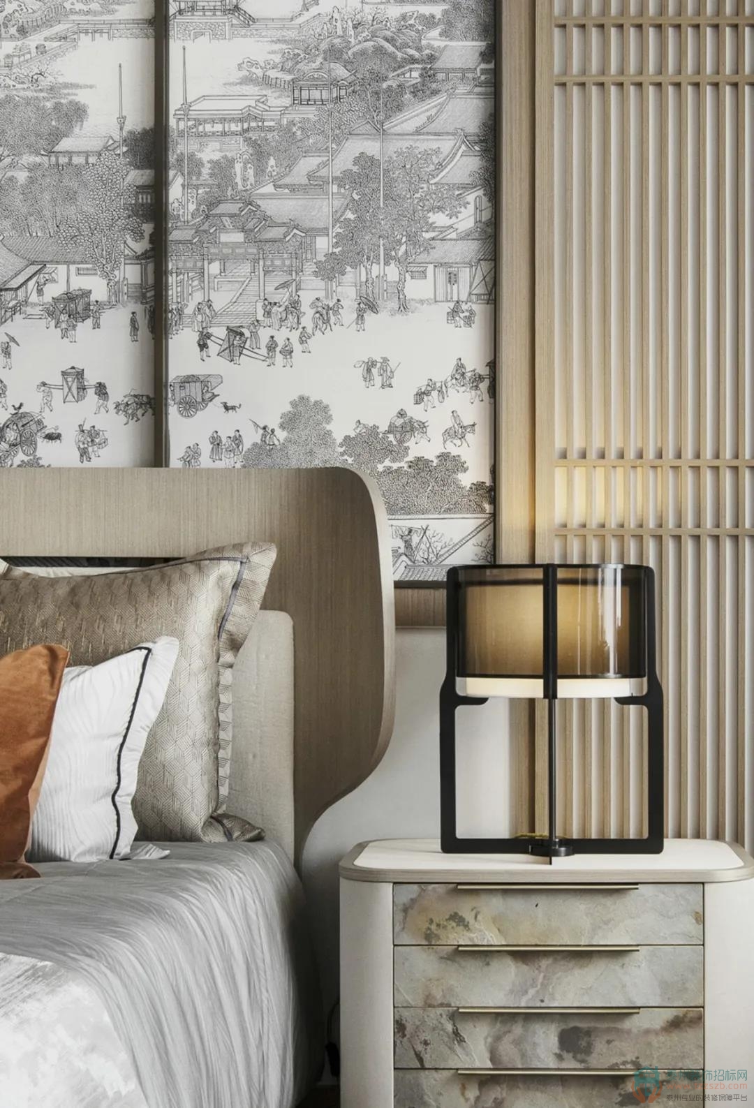 臥室背景以一幅風(fēng)俗畫徐徐展開,淺色木飾面為基調(diào),搭配富有自然肌理感的石材家具,碰撞出富有人文氣息且具現(xiàn)代品質(zhì)感的詩意禪韻。