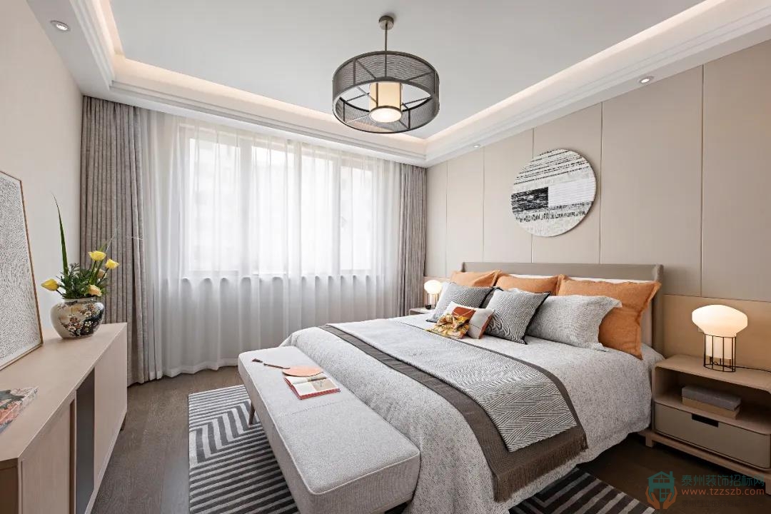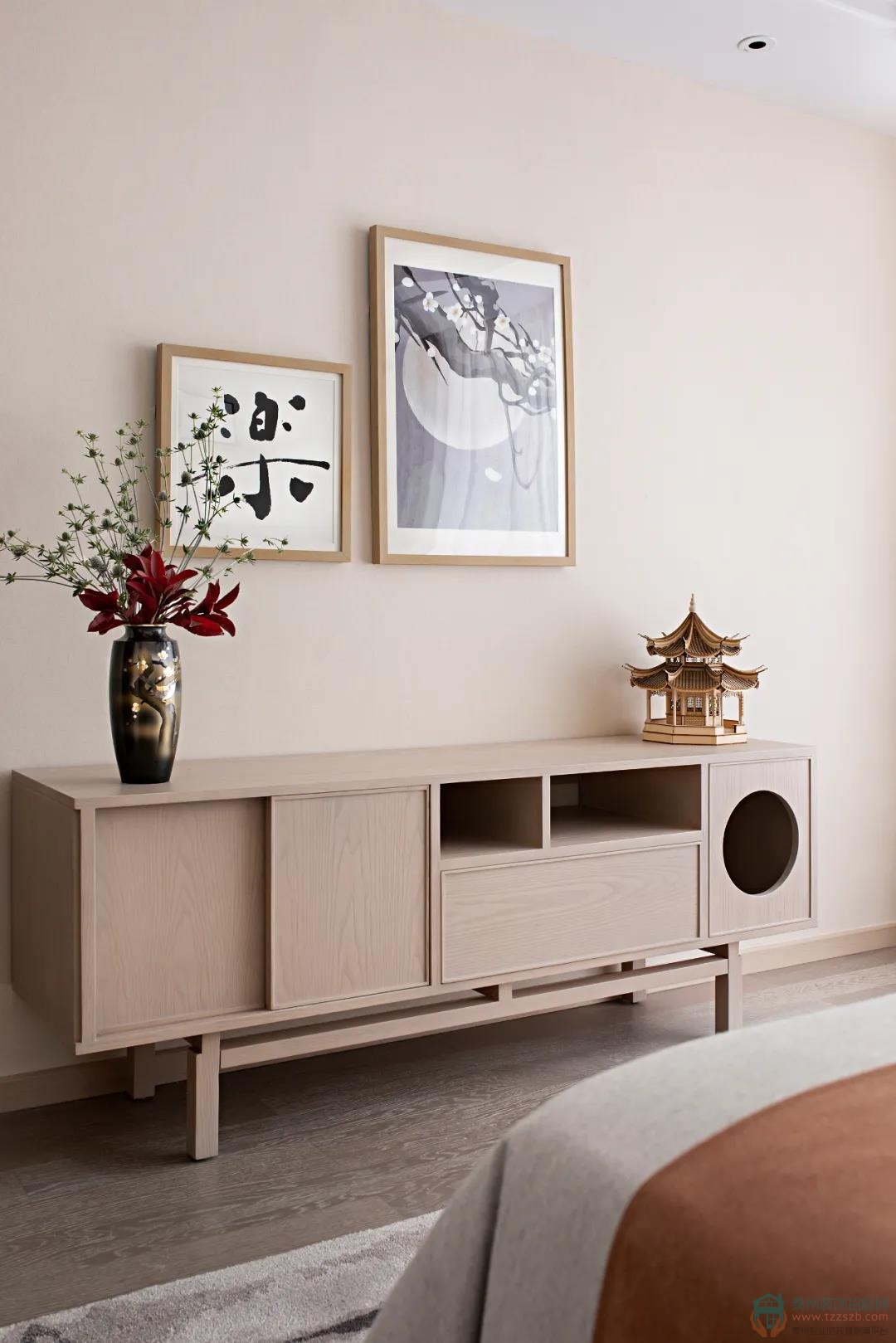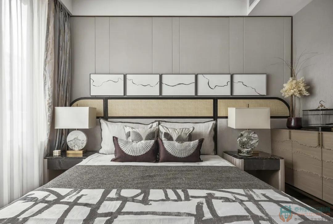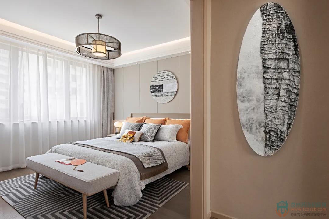臥室背景以一幅風(fēng)俗畫徐徐展開,淺色木飾面為基調(diào),搭配富有自然肌理感的石材家具,碰撞出富有人文氣息且具現(xiàn)代品質(zhì)感的詩意禪韻。