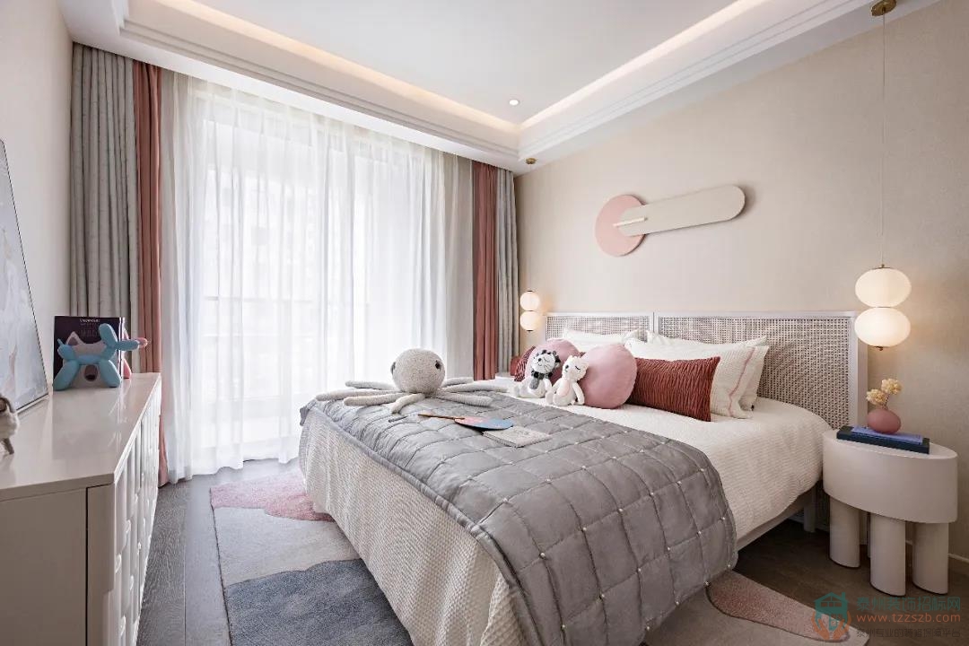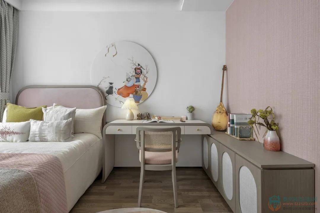 粉藍(lán)色統(tǒng)籌著女兒房的空間視覺美感,各式各樣可愛精巧的擺件陳設(shè),線條豐富的家具搭配,在空間中對話碰撞,表現(xiàn)出飽滿而趣味的明快氣質(zhì)。線條簡約的和風(fēng)柜面裝飾和掛畫,掩映著柔和的粉色色調(diào),貼心匹配小女兒活潑可愛的格調(diào)喜好。