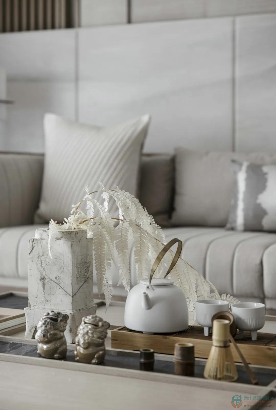整體的淺色灰調(diào),在色彩的選用上延續(xù)黑白灰為主,點(diǎn)綴綠色。軟裝材質(zhì)以實(shí)木,棉麻,皮藝為主,搭配玻璃,天然大理石,無指紋金屬等天然材質(zhì)為輔,利用花藝進(jìn)行點(diǎn)綴,以契合室內(nèi)空間中的氣質(zhì)——一種在韶華輪替中始終保有的從容與安詳。