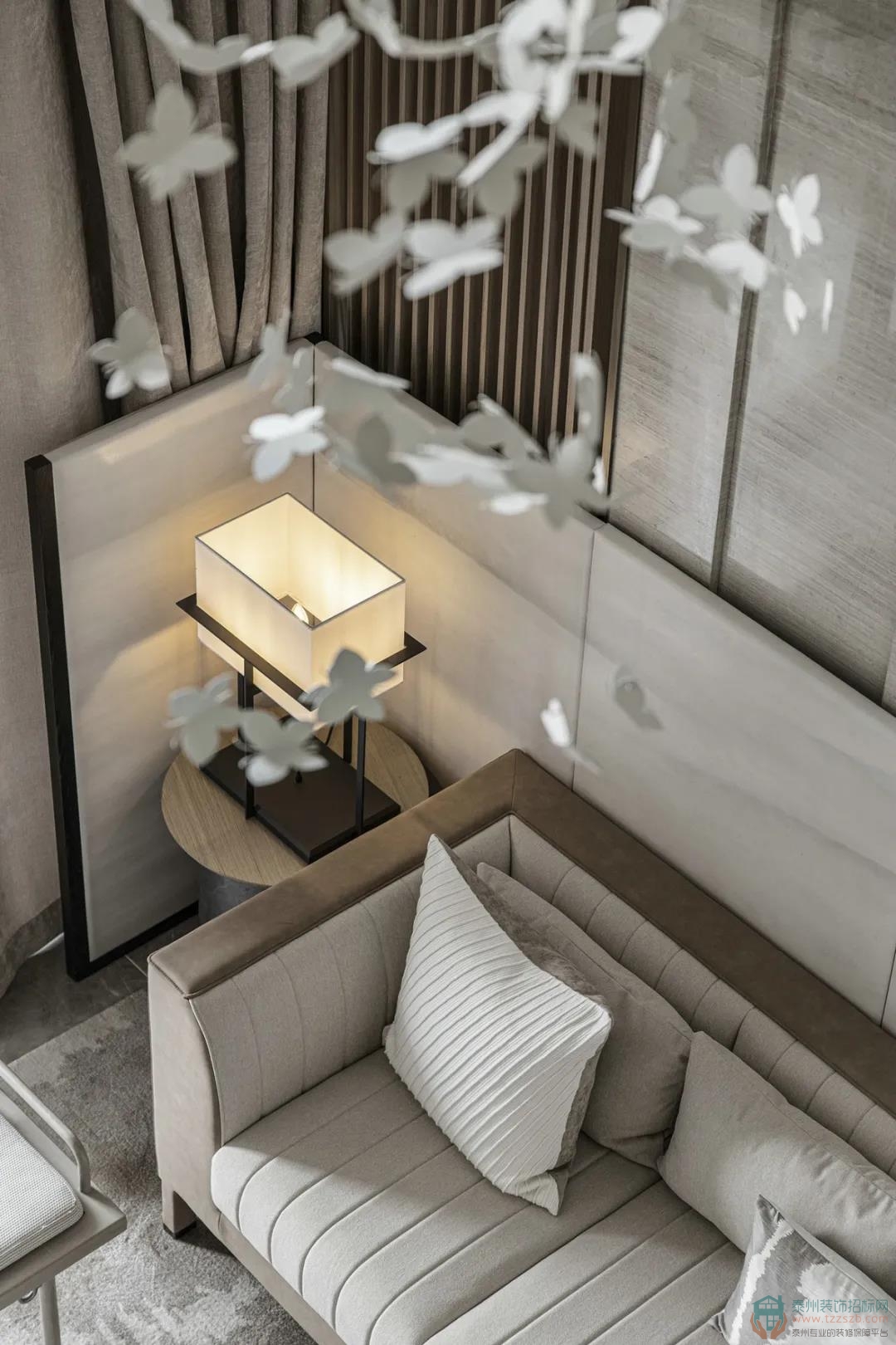 在飾品中加入一些很當(dāng)?shù)孛袼谆騻鹘y(tǒng)的小物品,通過這種沖突感形成藝術(shù)性。藝術(shù)吊燈形態(tài)如群蝶飛舞,與墻面藝術(shù)掛畫形成呼應(yīng), 就如畫中飛出的意境形態(tài)。