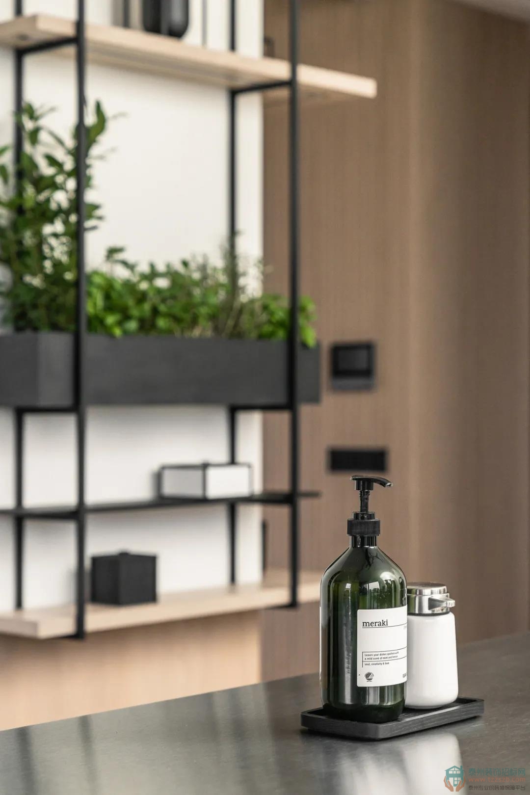 廚房設(shè)計(jì)主要從便捷性與實(shí)用性出發(fā),黑色的島臺(tái)可滿足多功能的需求。