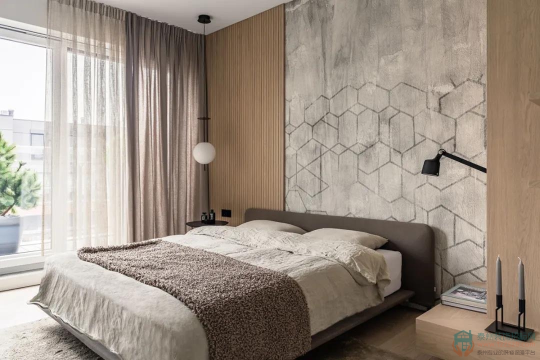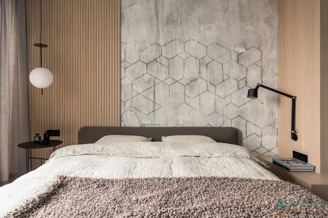 大面積的灰色和木色運(yùn)用,營(yíng)造出臥室的靜斂氛圍,并為安靜的休憩提供了保障。
